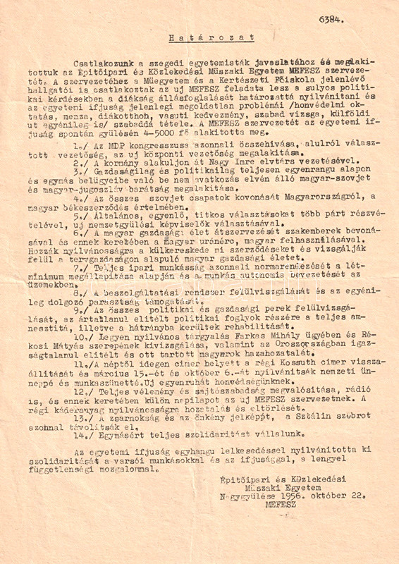 [Dokumentum, 1956.] A Műszaki Egyetem MEFESZ-szervezetének 14 pontja. Az 1956-os forradalom egyik alapító dokumentumának eredeti, sokszorosított, gépelt példánya. 6384-es számú határozat.