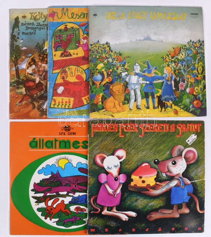 Leírás: 5 darab bakelit mesékkel, Oz, a nagy varázsló, Állatmesék, Minden egér szereti a sajtot, Mesemondó gyerekek, Kótyonfitty király almája.