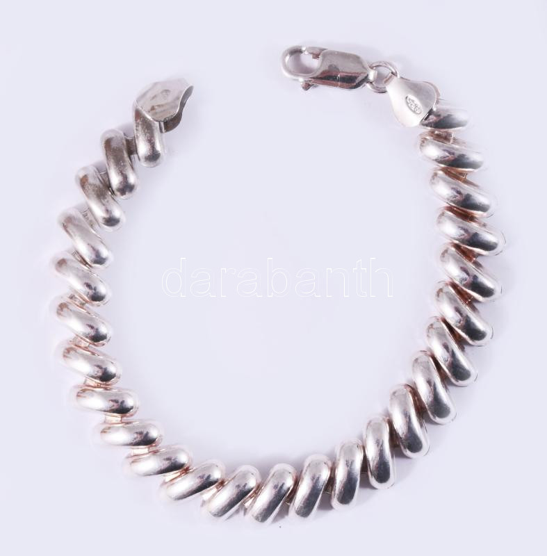 Ezüst (Ag) karkötő, jelzett, h: 17,5 cm, nettó: 12,6 g https://www.darabanth.com/hu/514-Filatelia-kepeslap-numizmatika-mutargy-konyv-papirregiseg-ekszer-aukcio/515.0/Nemesfem-disztargyak-ekszerek-dragakovek/Nemesfem-disztargyak-ekszerek-dragakovek~84/Ezust-Ag-karkoto-jelzett-h-17-5-cm-netto-12-6-g~II3482575