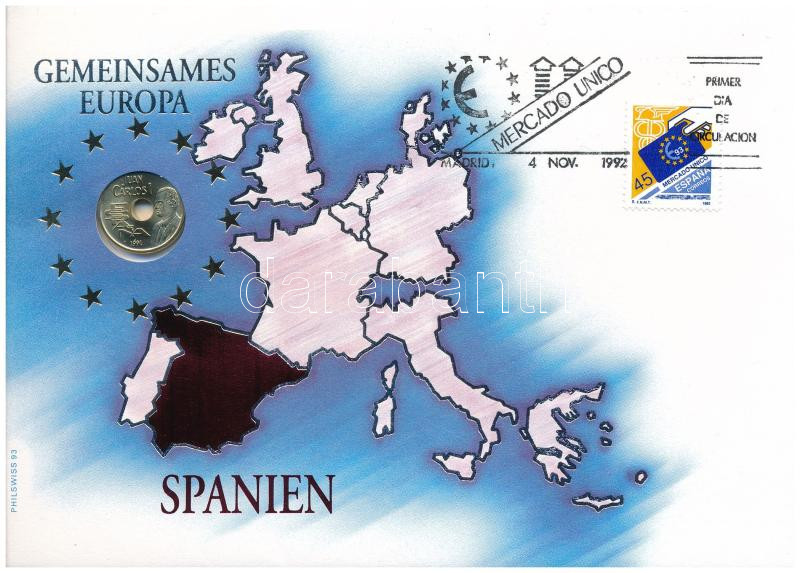 Spanyolország 1991. 25P Al-bronz "Közös Európa" felbélyegzett borítékban, bélyegzéssel, német nyelvű tájékoztatóval T:AU