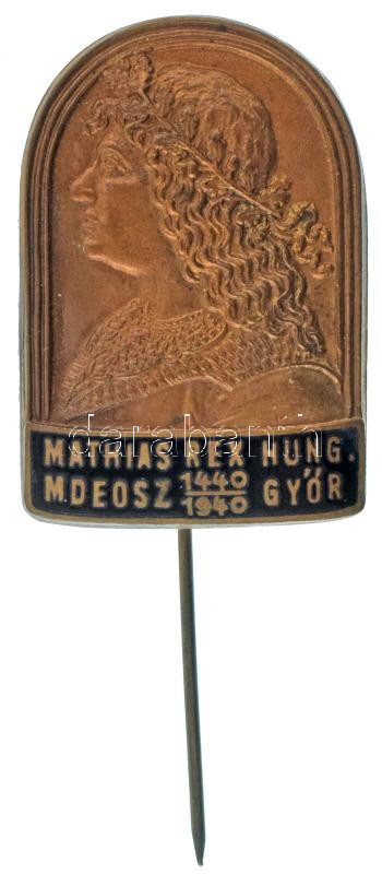 Leírás: 1940. "Mathias Rex Hung. MDEOSZ (Magyar Dalegyletek Országos Szövetsége) 1440-1940 Győr " zománcozott bronz dalos kitűző (34x24mm) T:AU