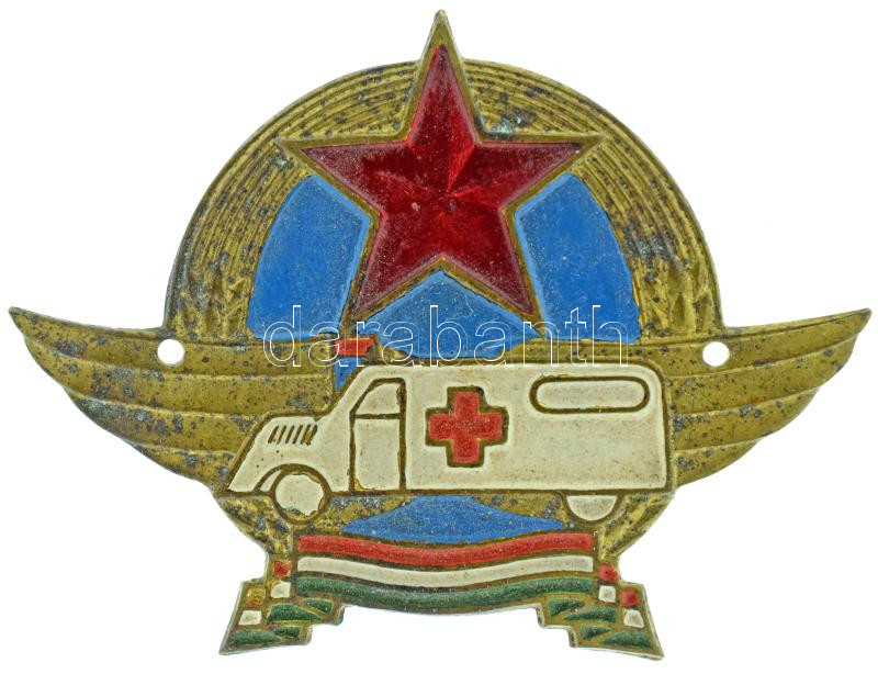 Leírás: 1950 k. Rákosi címeres mentős festett, lemez sapkajelvény (40x53mm) T:XF