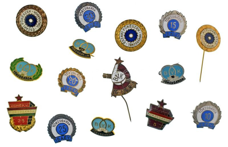 Leírás: 1960-1980 k. 15xklf "Törzsgárda" jelvényből álló tétel, közte zománcozott darabok, benne: BÁÉV, BVK, KOMÉP. V., Északi Fűrészek, Acélipari KTSZ T:vegyes