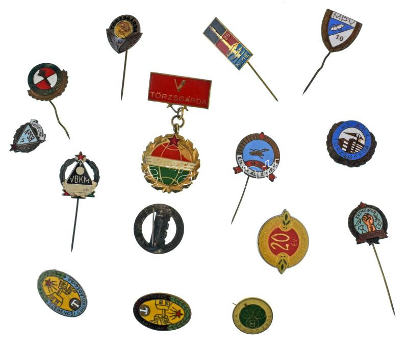 1960-1980 k. 15xklf "Törzsgárda" jelvényből álló tétel, közte zománcozott darabok, benne: Állami Építőipari Vállalat, 43 ÁÉV, Szerencsi Csokoládégyár, Közmű, NME, VBKM, 4. BSZV, BVV, Magyar Épdesipar, ÖKÜ, Kézműipar, MPV, Utasellátó T:vegyes egyiken tűhiány