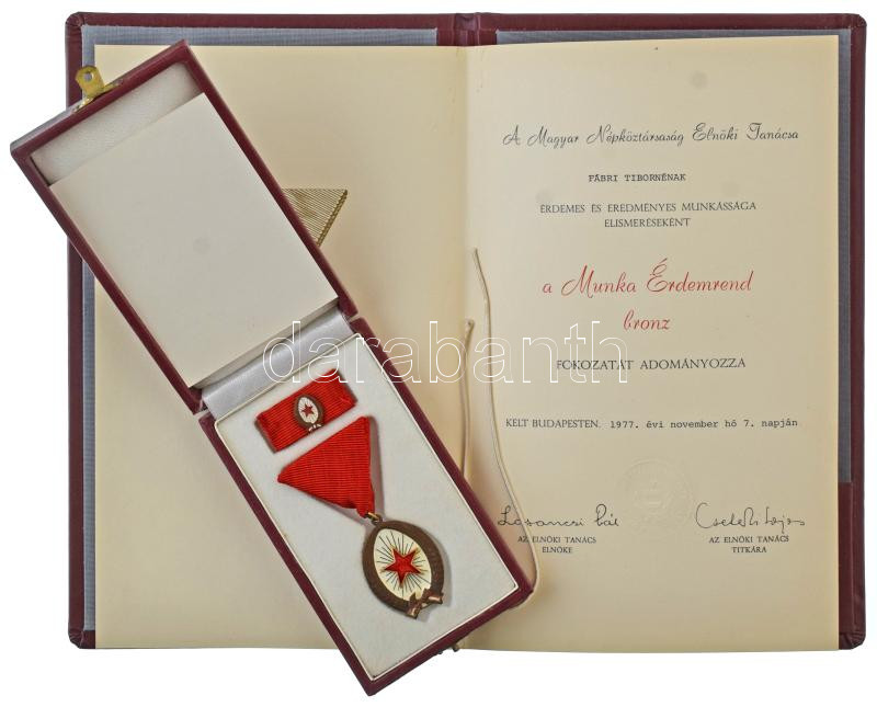 1977. "A Munka Érdemrend bronz fokozata" zománcozott bronz kitüntetés mellszalagon, miniatűrrel szalagsávon, eredeti tokban, adományozói okirattal és igazolvánnyal T:UNC
