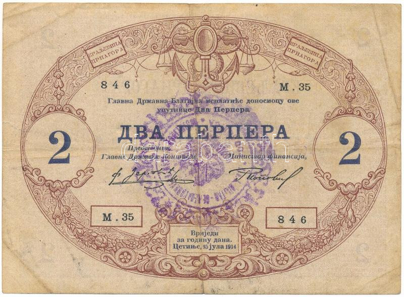 Monten... https://www.darabanth.com/hu/514-Filatelia-kepeslap-numizmatika-mutargy-konyv-papirregiseg-ekszer-aukcio/515.0/Numizmatika/Kulfoldi-bankjegyek~1316/Montenegro-1914-2P-felulbelyegzessel-M35-846-TF3Cbr-3E-Montenegro-1914-2-Perper-with-overp~II3480717
