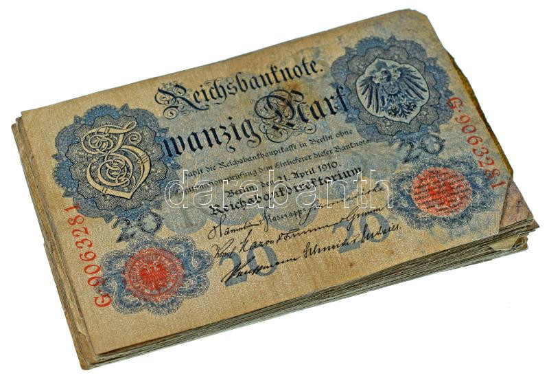 German Empire 1910-1914.... https://www.darabanth.com/hu/514-Filatelia-kepeslap-numizmatika-mutargy-konyv-papirregiseg-ekszer-aukcio/515.0/Numizmatika/Kulfoldi-bankjegyek~1316/Nemet-Birodalom-1910-1914-20M-50db-TF-VG3Cbr-3E-German-Empire-1910-1914-20-Mark-50pcs-CF-VG~II3483255