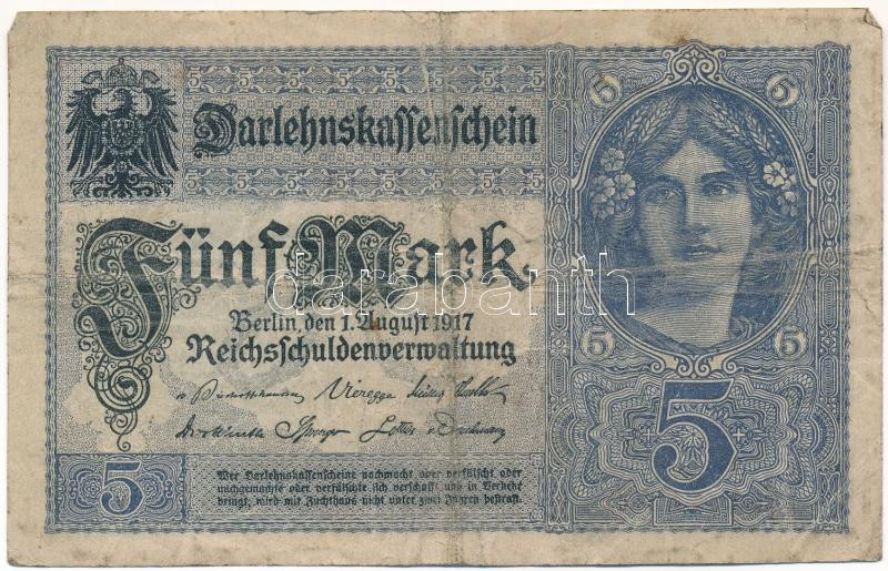 Német Birodalom 1917. 5M "8 jegyű sorozatszám" T:F,VG German... https://www.darabanth.com/hu/514-Filatelia-kepeslap-numizmatika-mutargy-konyv-papirregiseg-ekszer-aukcio/515.0/Numizmatika/Kulfoldi-bankjegyek~1316/Nemet-Birodalom-1917-5M-8-jegyu-sorozatszam-TF-VG-German-Empire-1917-5-Mark-8-digit-serial~II3206336