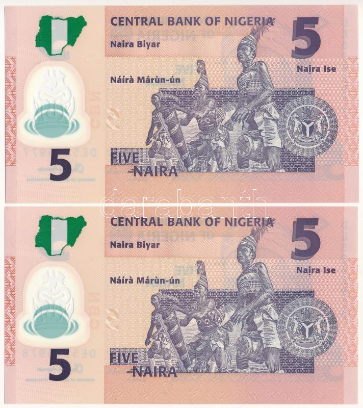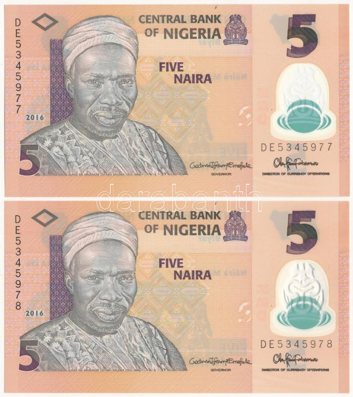 Nigeria 2016. 5 Naira (2x) ... https://www.darabanth.com/hu/514-Filatelia-kepeslap-numizmatika-mutargy-konyv-papirregiseg-ekszer-aukcio/515.0/Numizmatika/Kulfoldi-bankjegyek~1316/Nigeria-2016-5N-2x-sorszamkoveto-TUNC3Cbr-3E-Nigeria-2016-5-Naira-2x-consecutive-serial-n~II3464983