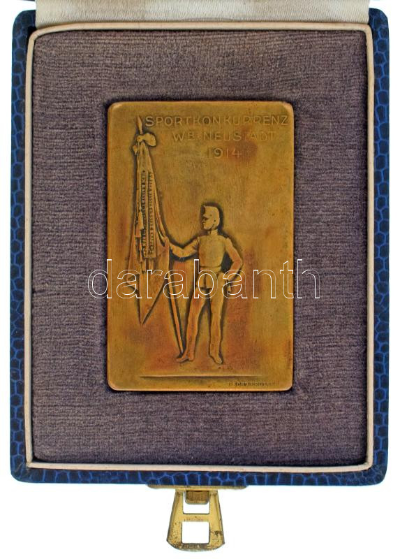 German Empire 1914. "Sportkonkurrenz W R Neustadt 1914" (Sports competition in Neustadt) two-sided bronze award plaque, in a worn case. Sign.: "Johann Schwerdtner" (38x59mm) C:VF, patina
