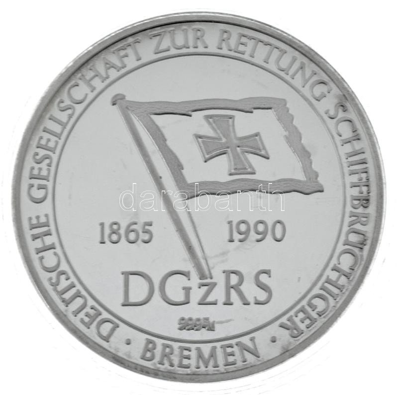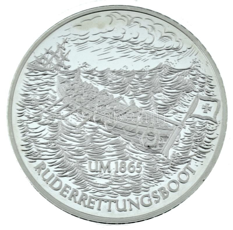 Leírás: Németország 1990. "Deutsche Gesellschaft zur Rettung Schiffbrüchiger - Bremen - 1865-1990 - DGzRS / Ruderrettungsboot - um 1865 (Német Tengeri Mentő Egyesület - Bréma - 1865-1990 / Evezős mentőcsónak - 1865 körül)" jelzett Ag emlékérem kapszulában (~15g/0.999/35mm) T:AU (eredetileg PP) folt