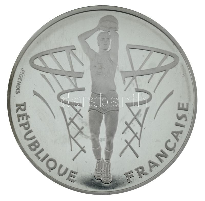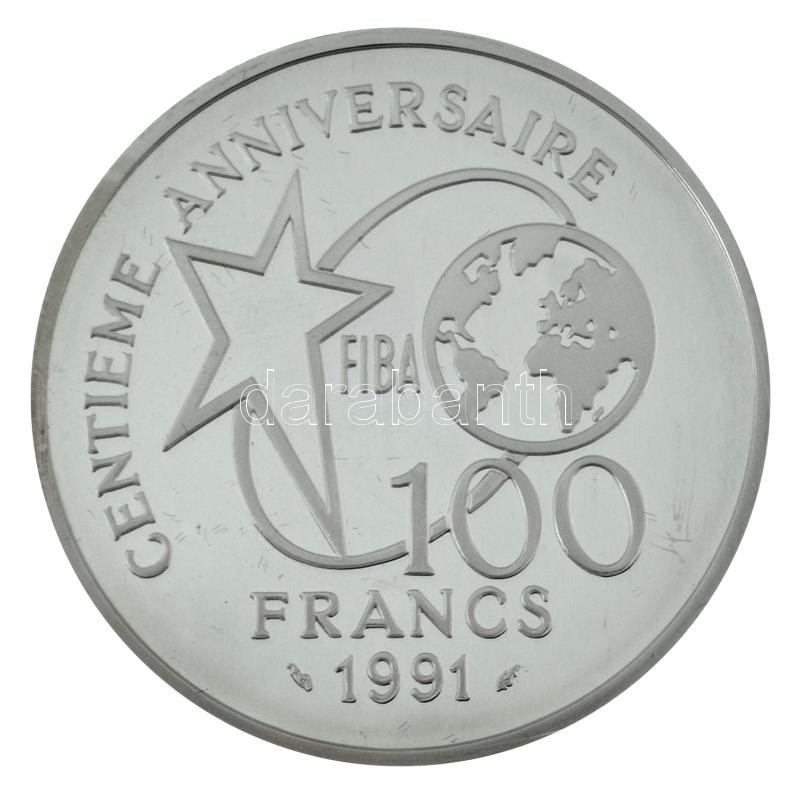 Franciaország 1991. 100Fr Ag "100 éves a kosárlabda sport" sorszámozott "7456" tanúsítvánnyal, dísztokban T:PP fo.
