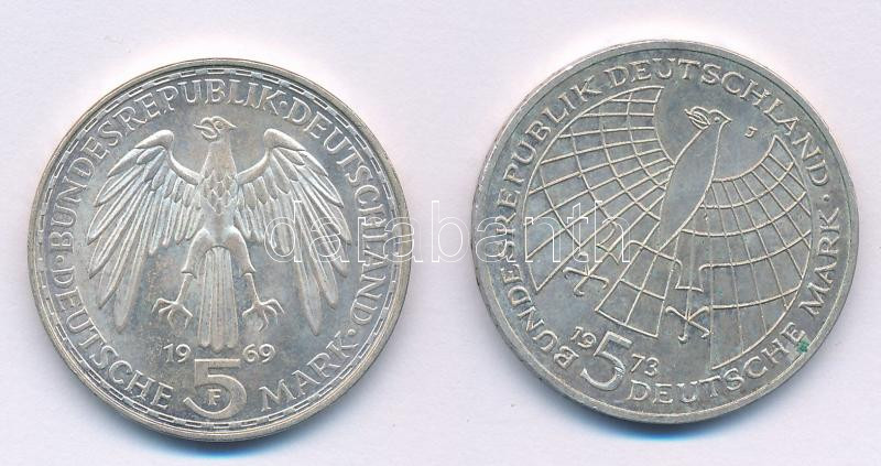 Német Szövetségi Köztársaság1969F 5M Ag "Gerhard Mercator" + 1973J 5M Ag "Kopernikusz születésének 500. évfordulója" T:AU patina