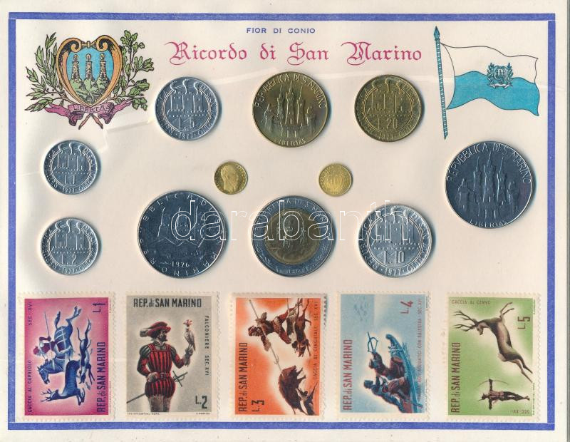 San Marino 1976-1982. 1 Lira - 500 Lire (9xdiff) + 2pcs modern mini gilt medallion, each glued to a cardboard sheet, with stamps, in a souvenir set C:AU,XF