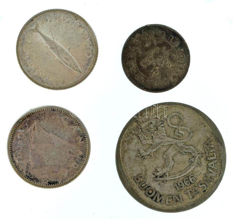 Leírás: Vegyes: Finnország 1966. 1M billon + Holland Kelet-India 1945. 1/10G Ag + Kanada 1960. 10c Ag "II. Erzsébet" + 1967. 10c Ag "Kanada megalakulásának 100. évfordulója" T:XF-F patina