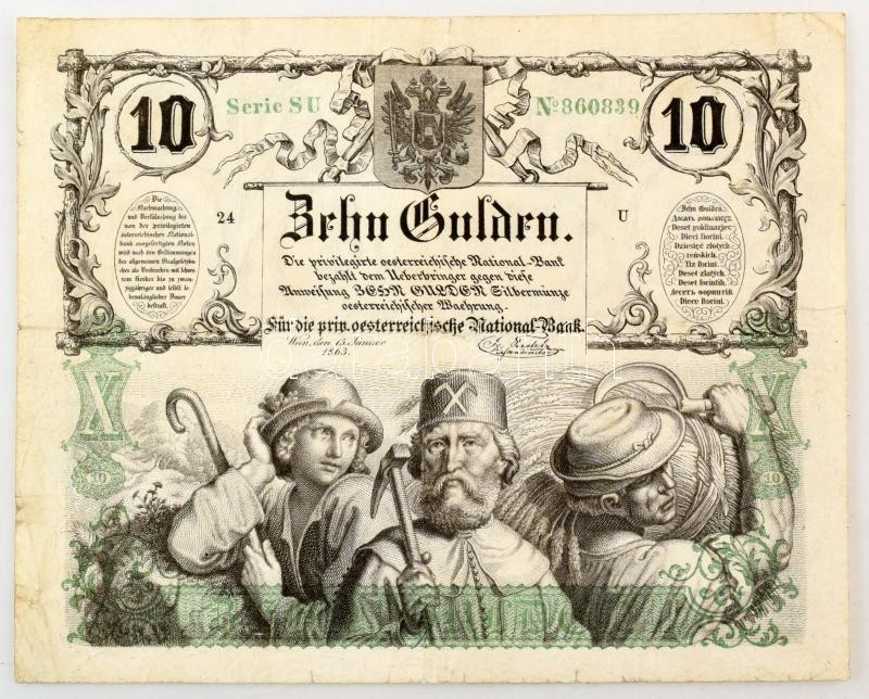 Habsburg Empire 1863. 10 Gulden on watermarked paper "SU 860839" C:F small tears, small hole at the middle, and small holes, otherwise strong paper
