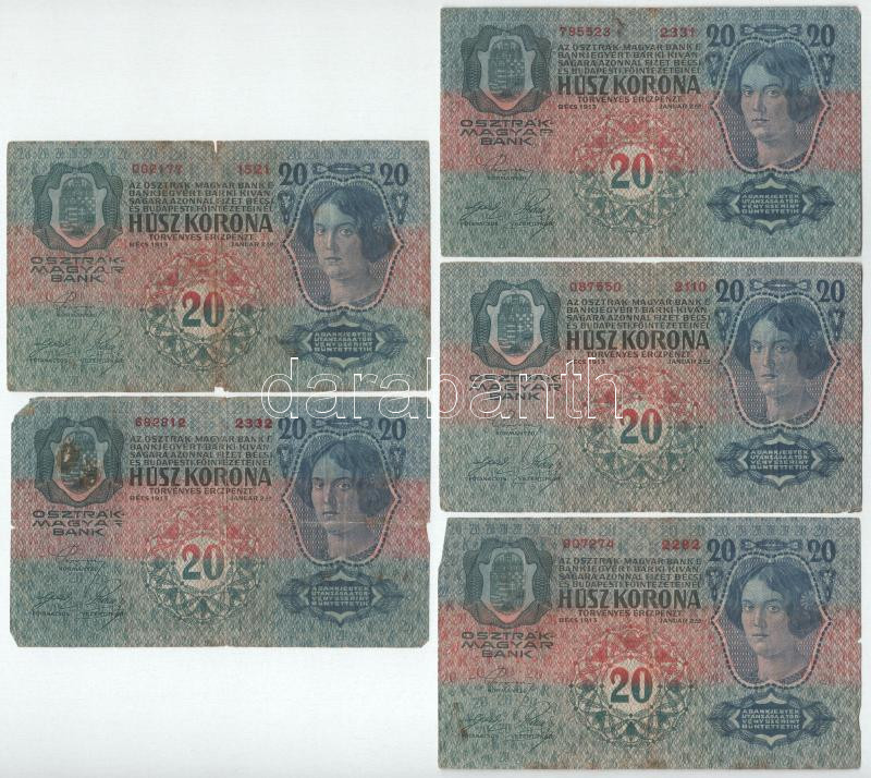 Leírás: 1913. 20K (5x) felülbélyegzés nélkül T:F,VG