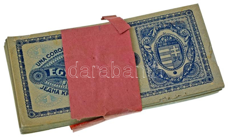 Hungary 1920. 1 Korona (100x) consecutive serials with original, hardly damaged wrap "aa 003 418701 - aa 003 418800" C:AU some pieces with folded corners (the last 3pcs VG unfolded, missing material due to mouse marks)