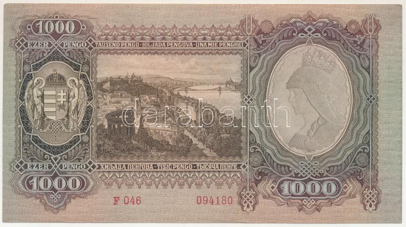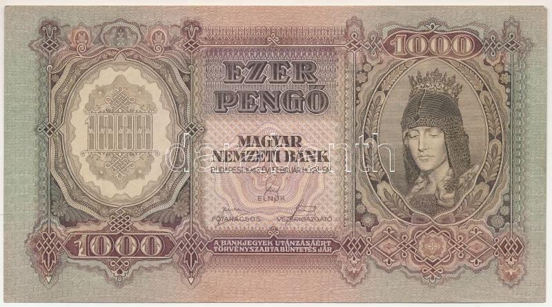 Leírás: 1943. 1000P "F 046 094180" T:AU,XF papírránc, középtájt nem végigérő hajlás