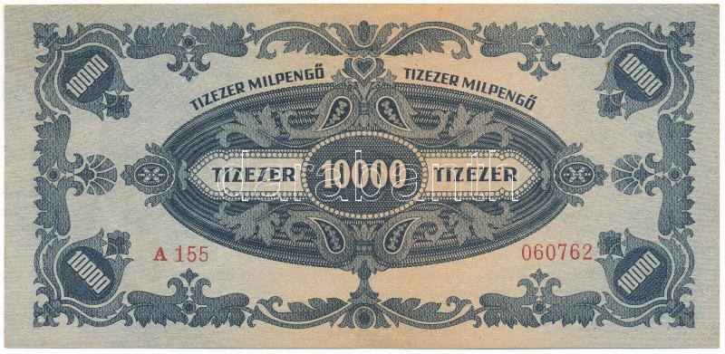 Leírás: 1946. 10.000MP címer látványosan eltolódott az alapnyomathoz képest, értékjelzés és keltezés között kis sortávolság T:XF