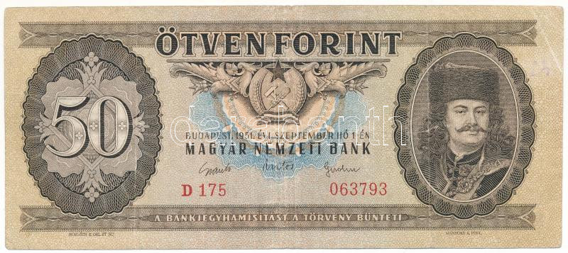 Leírás: 1951. 50Ft "D 175 063793" T:F,VG, firka-nyom a jobb szélén