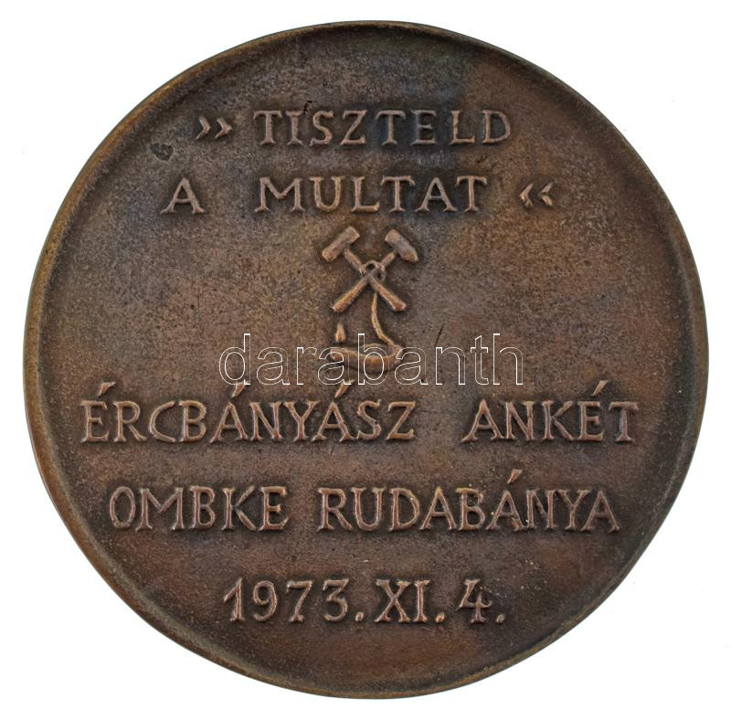 Leírás: 1973. "Tiszteld a múltat - Ércbányász Ankét OMBKE Rudabánya 1973. XI. 4 " kétoldalas, öntött bronz emlékérem, hátoldalán Rudabánya városi pecsétjének negatívja (70mm) T:AU,XF