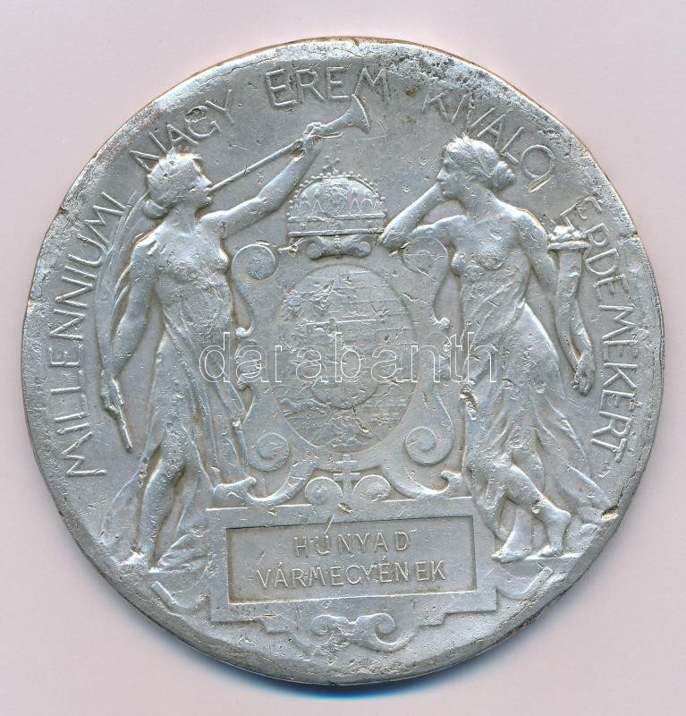 Beck Ö. Fülöp (1873-1945) 1896. "1896-iki Ezredéves Országos Kiállitás / Milleniumi Nagy Érem Kiváló Érdemekért - Hunyad vármegyének" kétoldalas, ezüstözött bronz emlékérem, kapszulában (85mm) T:F több ph. és karcok