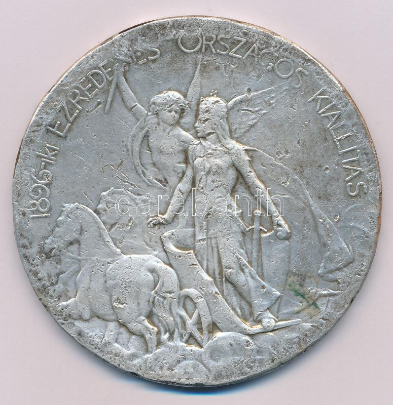 Hungary 1896. "Medal of the Millenium Exhibition of 1896 / Great Medal of Merit of the Millenium - For Hunyad county" double-sided silver plated bronze commemorative medallion, in capsule Sign.: Fülöp Beck Ötvös (85mm) C:F many edge errors and scratches