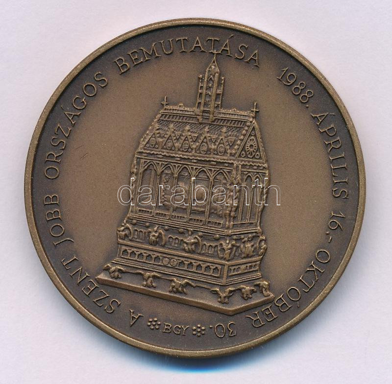Bognár György (1944-) 1988. MÉE "Államalapító királyunk halálának emlékére 1038-1988 / A Szent Jobb országos bemutatása - 1988 április 16.-október30." kétoldalas, bronz emlékérem (42,5mm) T:AU patina