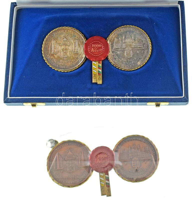 Bozó Gyula (1913-2004) 1990. "A Szent Szék és a Magyar Köztársaság közötti diplomáciai kapcsolat felvételének emlékére" vatikáni / magyar fehérfém érempár stilizált "Bozó" pecséttel összeillesztve + vatikáni / magyar bronz érempár stilizált "Bozó" pecséttel összeillesztve (2xklf érempár) "No 722" sorszámozással Szign.: Bozó Gy. eredeti dísztokban T:AU patina
