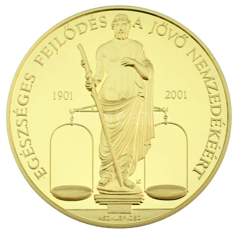 Leírás: Kósa István (1953-) 2001. "Richter Gedeon RT. 2001 Centenárium / Egészséges fejlődés a jövő nemzedékéért - Aszklépiosz " kétoldalas aranyozott fém emlékérem kapszulában (42mm) T:PP