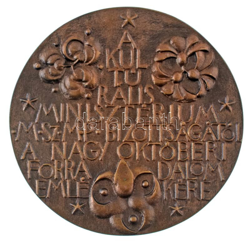 Leírás: Ligeti Erika (1934-2004) DN "A Kulturális Minisztérium MSZMP Bizottságától a Nagy Októberi Forradalom emlékére " bronz plakett (87mm) T:AU