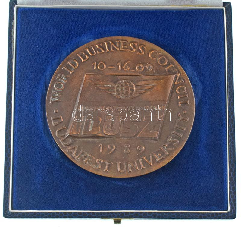 Nagy István János (1938-) 1989. "Budapest / Budapesti Egyetem - Üzleti Világtanács - IBUSZ (Idegenforgalmi, Beszerzési, Utazási és Szállítási Részvénytársaság) 1989.09.10-16." kétoldalas, öntött bronz emlékérem dísztokban (95mm) T:AU