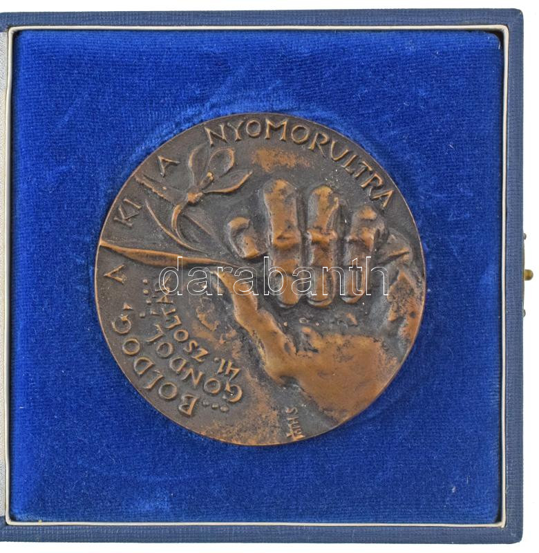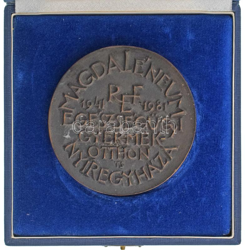 Tóth Sándor (1933-2019) 1981. "Magdaléneum - 1941 Ref 1981 Egészségügyi Gyermekotthon - Nyíregyháza / ...Boldog, aki a nyomorultakra gondol 41. zsoltár" kétoldalas, öntött bronz plakett, eredeti dísztokban (86mm) T:AU