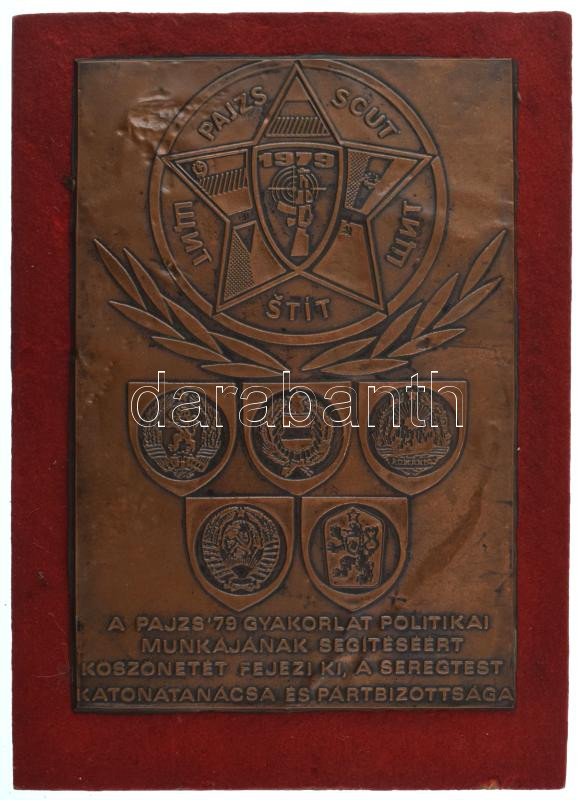 1979. "A Pajzs '79 gyakorlat politikai munkájának segítéséért köszönetét fejezi ki, a Seregtest Katonatanácsa és Pártbizottsága" egyoldalas bronz lemezplakett filc borítású fa talpon (225x152mm) T:XF