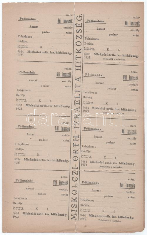 1923. "Miskolci orth. izr. hitközség / Pótimaház" női imaszékre szóló bárca, kitöltetlen, ellenőrzőszelvénnyel, perforált ívben, ortodox izraelita hitközség (összesen 8 pár) / Hungary 1923. "Orthodox Jewish Congregation of Miskolc / Alternative prayer house" paper token for a women's prayer chair, blank, with a check slip, in a perforated sheet (8 pairs in total)