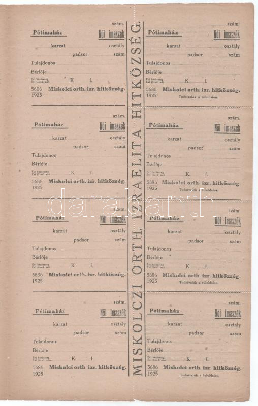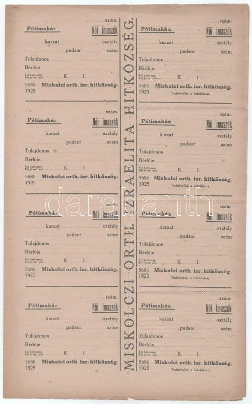 1925. "Miskolci orth. izr. hitközség / Pótimaház" női imaszékre szóló bárca, kitöltetlen, ellenőrzőszelvénnyel, perforált ívben, ortodox izraelita hitközség (összesen 8 pár) / Hungary 1925. "Orthodox Jewish Congregation of Miskolc / Alternative prayer house" paper token for a women's prayer chair, blank, with a check slip, in a perforated sheet (8 pairs in total)