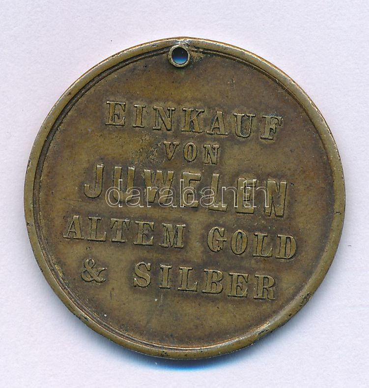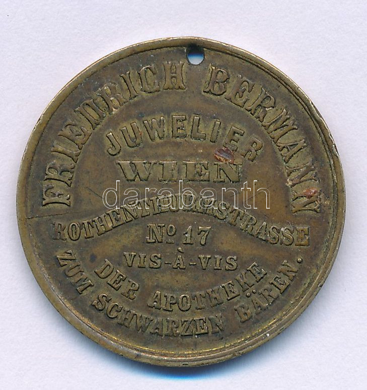 Austria cca 1850-1900. "Friedrich Bermann Juwelier - Wien Rothenthurmstrasse no.17. vis-á-vis der Apotheke zum Schwarzen Bären / Einkauf von Juwelen alten Gold und Silber (Friedrich Bermann Juwelier - Vienna Rothenthurmstrasse no.17. opposite the Black Bear Pharmacy / Purchase of jewels old gold and silver)" bronze advertising token (27mm) C:XF holed