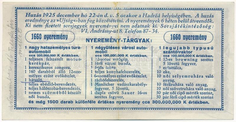 Hungary / Budapest 1925. "Hadirokkantak, Hadiözvegyek, Hadiárvák Nemzeti Szövetsége Tárgysorsjátéka (Lottery Game of the National Association of Veterans, War Widows, and War Orphans)" lottery ticket about 5000 Korona, with embossed stamp, with "A 62391" serial number C:XF
