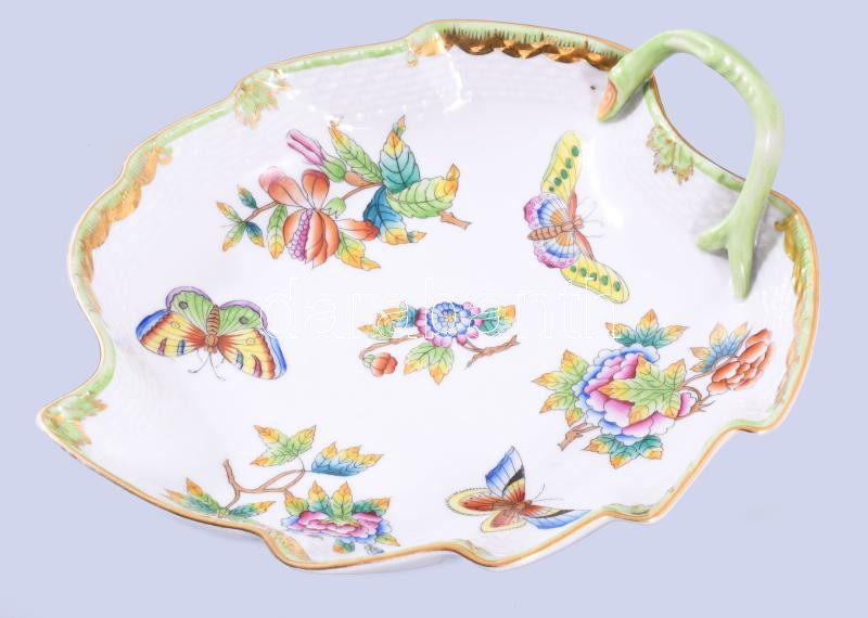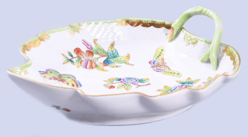 Leírás: Herendi Viktória mintás levél alakú kínáló, jelzett, aranyozáson kopással, 20x17 cm