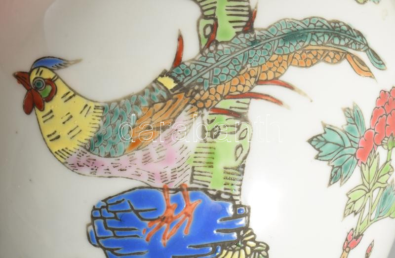 Leírás: Kínai paradicsommadár mintás váza, jelzett, m: 13,5 cm