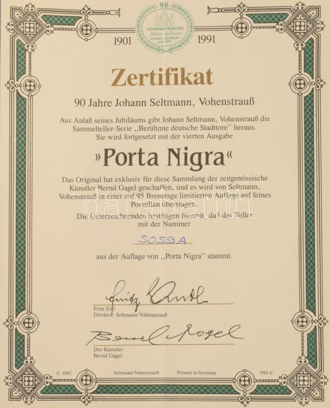 "Porta Nigra" porcelán dísztál, jelzett, hibátlan, d: 19,5 c... https://www.darabanth.com/hu/514-Filatelia-kepeslap-numizmatika-mutargy-konyv-papirregiseg-ekszer-aukcio/515.0/Porcelan-keramia-uveg/Porcelan~572/Porta-Nigra-porcelan-disztal-jelzett-hibatlan-d-19-5-cm-certifikattal~II3481589
