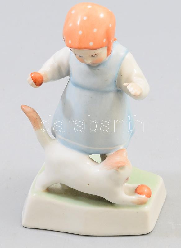 Leírás: Zsolnay macskával játszó kislány. Jelzett, kézzel festett, hibátlan, m: 14 cm