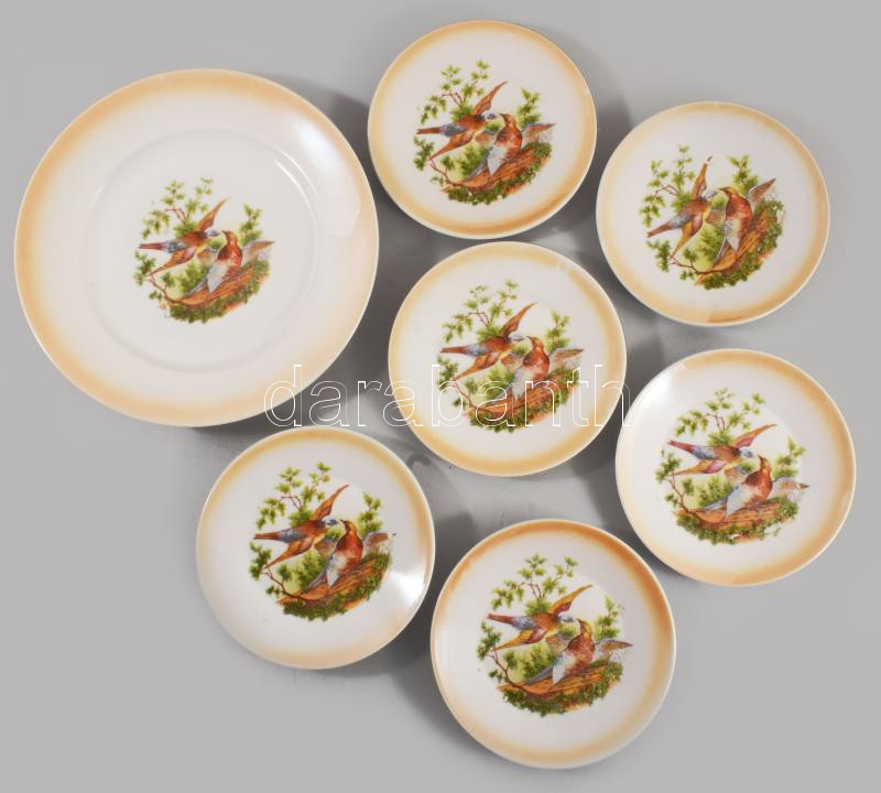 Leírás: cca 1920/30 Zsolnay vadászmintás süteményes készlet, jelzett, kis kopással, d: 15-24 cm