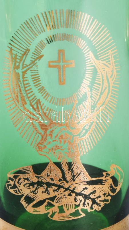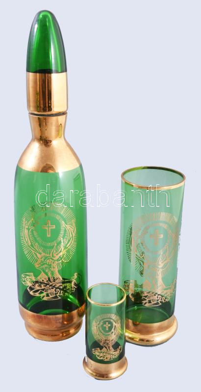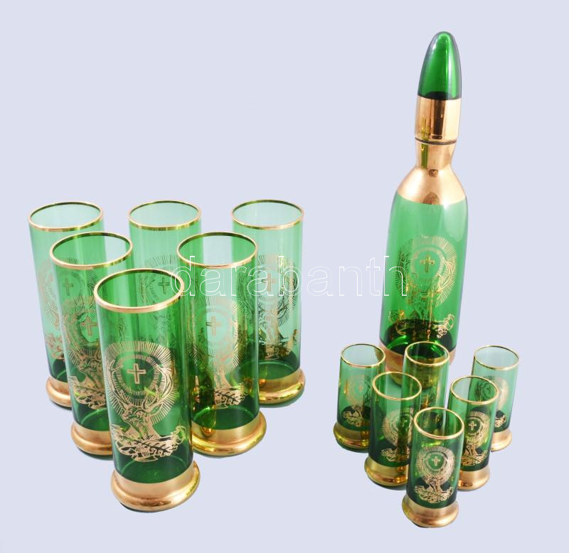 Leírás: Bohemia vadászmintás zöld üveg italos szett, kiöntő, 6 db nagyobb és 6 db kisebb pohár, egyik poháron jelzett, m: 7-28 cm