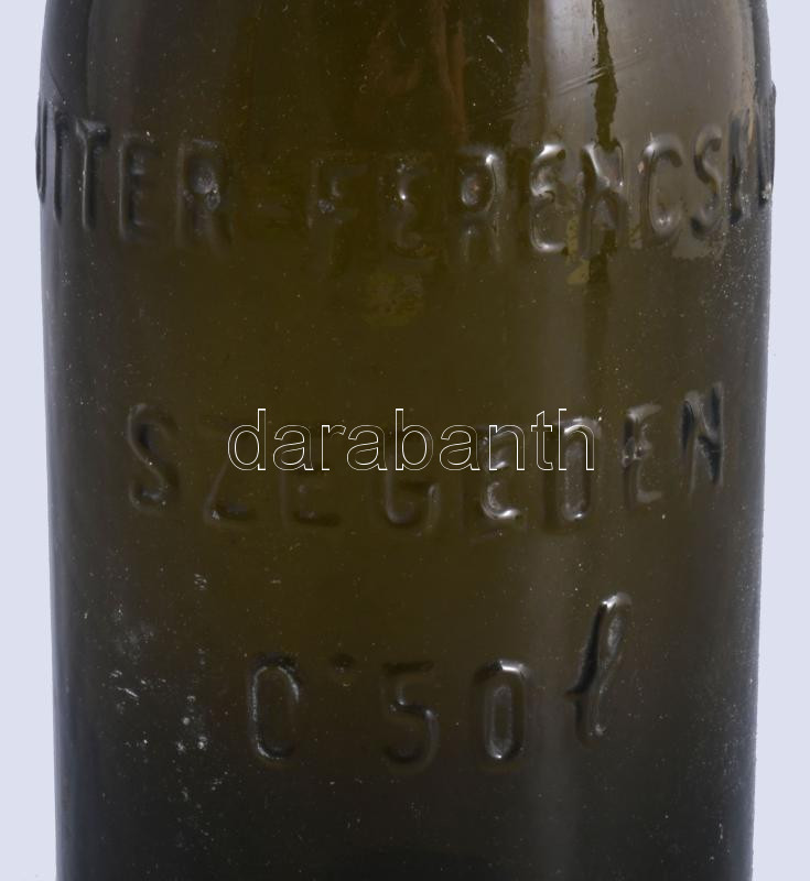 Leírás: Hutter-Ferencsevits Szeged sörös üvegpalack, kopásnyomokkal, 0,5 l, m: 28,5 cm