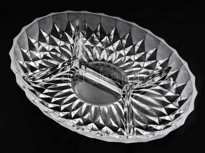 Leírás: Kristályüveg négyosztatú mogyorókínáló, hibátlan, részben savmaratott díszítéssel, 28x20,5 cm