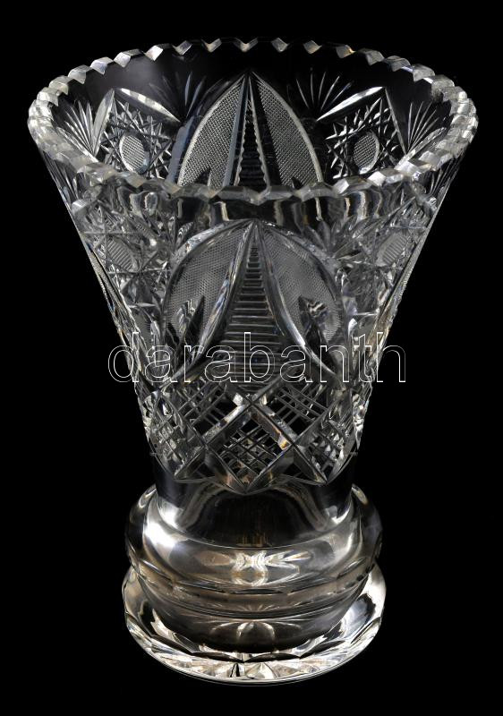 Leírás: Ólomkristály váza, jelzés nélkül, gazdagon csiszolt mintával, kis kopással, m: 18 cm