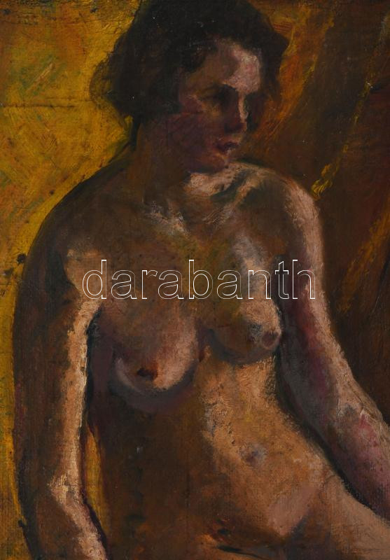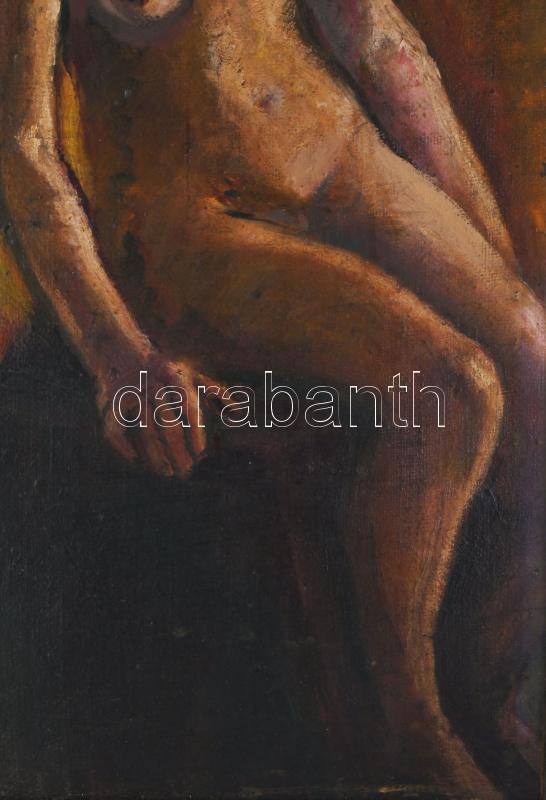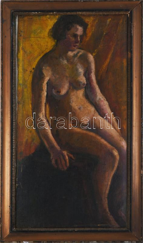 Jelzés nélkül, XX. sz. első fele, feltehetően magyar festő: Ülő női akt. Olaj, vászon, dublírozott, restaurált. Proveniencia: Saphier-gyűjtemény. Dekoratív, sérült fakeretben, 79,5x41,5 cm.