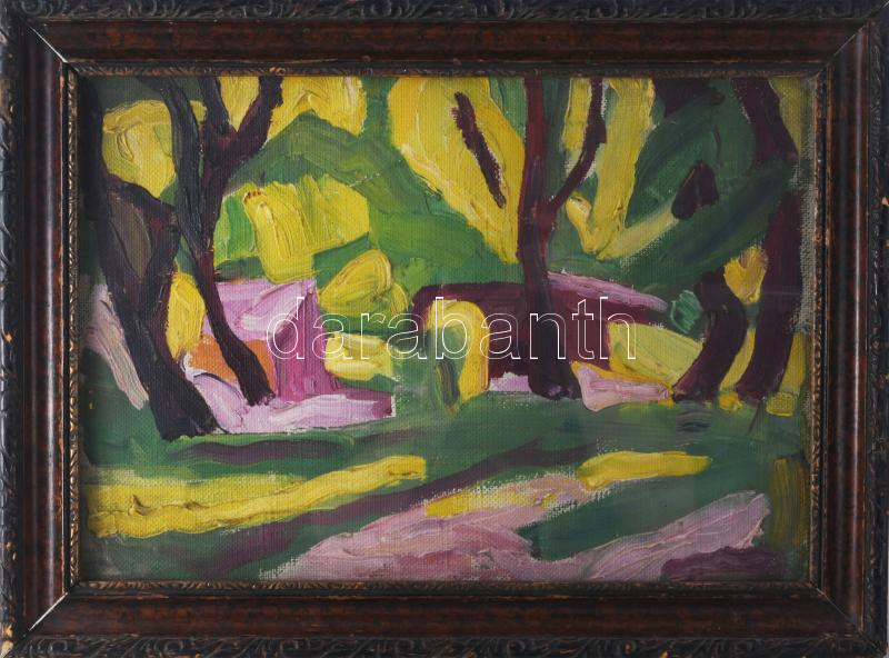 Jelzés nélkül, XX. sz. magyar festő: Expresszív táj. Olaj, vászon, kartonon. Proveniencia: Saphier-gyűjtemény. Üvegezett, kopott fakeretben. 26x38 cm